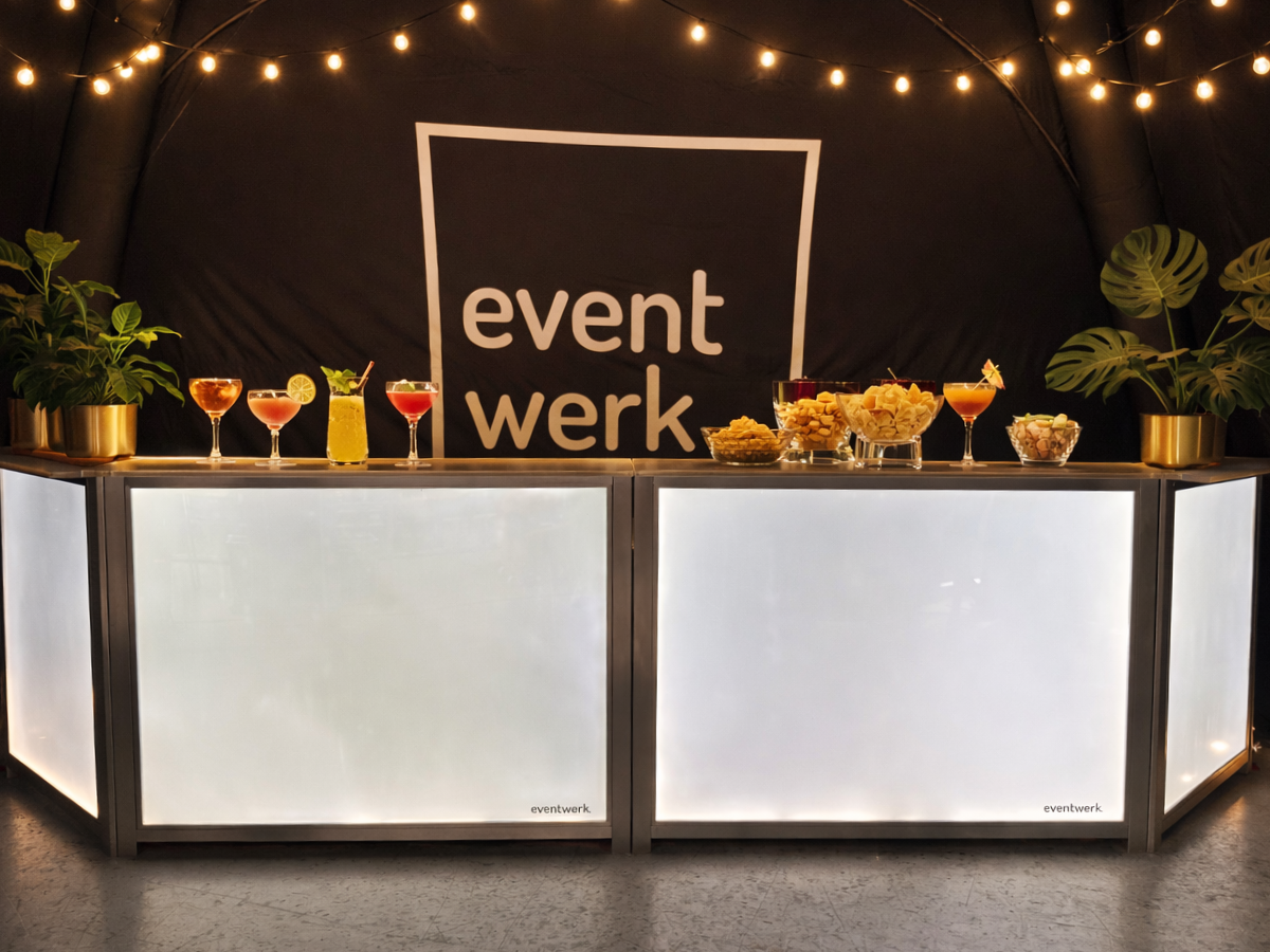 Die Cocktailbar von eventwerk. kombiniert moderne LED-Technik mit hochwertigem Design. Insgesamt drei Bars stehen zur Verfügung – flexibel einsetzbar einzeln oder im Set. Die farblich einstellbare Beleuchtung sorgt immer für die passende Atmosphäre – von elegant bis extravagant. Durch das personalisierbare Branding wird jede Bar zu einem echten Unikat, perfekt abgestimmt auf dein Event oder deine Marke. Funktional, auffällig, stilvoll – die perfekte Barlösung.